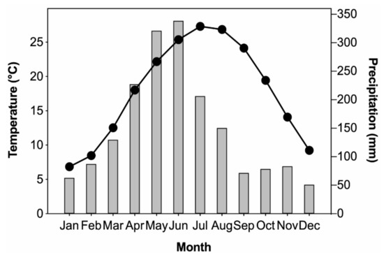 Climate data from two meteorological stations (Guilin, 25.32° N, 110.30° E, 164.4 m a.s.l.; Ziyuan, 26.03° N, 110.63° E, 408.4 m a.s.l.) near the sampling site were obtained from the National Meteorological Information Center (http://data.cma.cn/). The climate parameters include the monthly mean temperature and monthly total precipitation. Regional mean climate was calculated by averaging the records of the two meteorological stations over their common period of 1957–2016 to decrease the environmental heterogeneity effects. As shown in Figure 2, the monthly mean temperature of the study area ranges from 6.9 °C to 27.3 °C, and monthly total precipitation ranges from 51.0 mm to 338.6 mm. January is the coldest month (6.8 °C), while July is the hottest (27.3 °C). The rainy season is from March to August, accounting for 76.0% of the annual total precipitation. Furthermore, based on meteorological records of Xing’an, Ziyuan, and Longsheng stations near the MRS mountain, the annual mean sunshine duration varied from 1309.4 h to 1467.1 h, the annual mean wind speed varied from 2.1 m/s to 3.2 m/s, the annual mean relative humidity varied from 79% to 82%, and the annual mean frost day varied from 7.3 days to 15.5 days [35]. Based on the daily temperature and precipitation data of 81 meteorological stations in Guangxi during 1961–2016, the frequency of persistent low temperatures and the snow freezing process in Guangxi has been 2 times/10a since the 1990s, with average days of 23.7 day/10a [44]. According to the Köppen-Geiger climate classification [45,46], the study area features a humid subtropical climate.