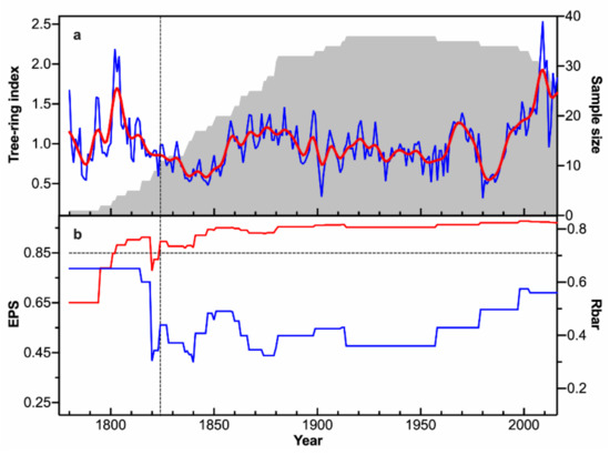 Figure 3 shows the TRW chronology in this study and its corresponding sample size, Rbar, and EPS statistics. The TRW chronology ranges from 1780 to 2016. The series length varies between 96 and 235 years, with mean length of 163 years. The SD is 0.34, the MS is 0.18, and the AC1 is 0.75 (Table 1). The reliable period of the TRW chronology spans from 1824 to 2016, according to the EPS threshold value 0.85 [43]. The Rbar ranges from 0.30 to 0.65, with an average value of 0.46. These statistics indicate a good quality of the TRW chronology.