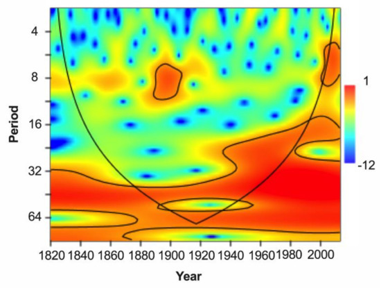 - Torrence, C.; Compo, G.P. A practical guide to wavelet analysis. Bull. Am. Meteorol. Soc. 1998, 79, 61–78. [Google Scholar] [CrossRef] [Green Version]