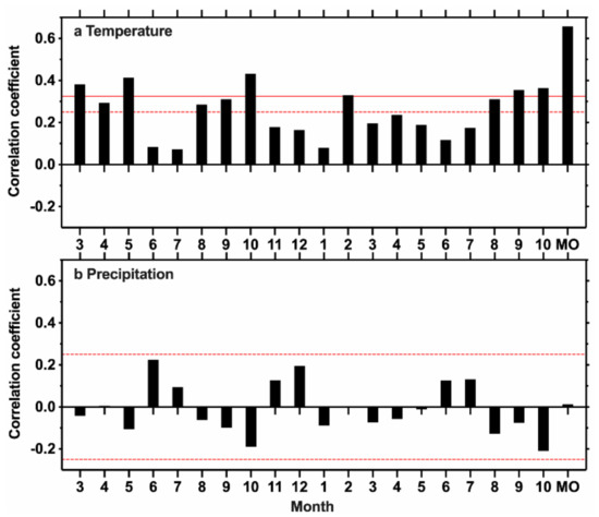 Correlation coefficients of the TRW chronology with (a) monthly mean temperature and (b) monthly total precipitation from the previous March to the current October during the common period 1958–2016. MO (previous March to previous October) represents the target months for reconstruction. Horizontal solid (dash) line denotes the 0.01 (0.05) significance level, respectively.