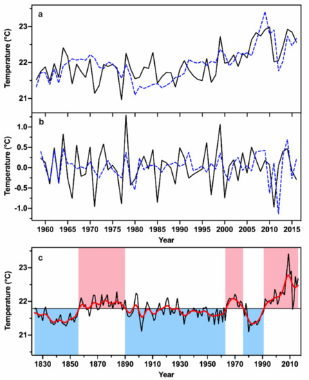 The pMar-pOct mean temperature was reconstructed in the study area for the past 193 years (Figure 6c). The mean and SD of the reconstructed pMar-pOct temperature are 21.79 °C and 0.34 °C, respectively. Decadal and multi-decadal variations were found in the pMar-pOct mean temperature reconstruction. Based on a 11-year lowpass FFT filter and its mean value, three major warm (1857–1890, 1964–1976, and 1992–2016) and cold (1824–1856, 1891–1963, and 1977–1991) periods were found in the reconstruction period from 1824 to 2016. The top 10 warmest and coldest years are listed in Table 2. The extremely warm (cold) years were defined as the years with the temperature values higher (lower) than 1.5 SD, respectively. Nine extremely warm years (2009, 2008, 2011, 2010, 2014, 2016, 2007, 2015, and 1999) and three extremely cold years (1980, 1902, 1847) were identified over the reconstruction period.