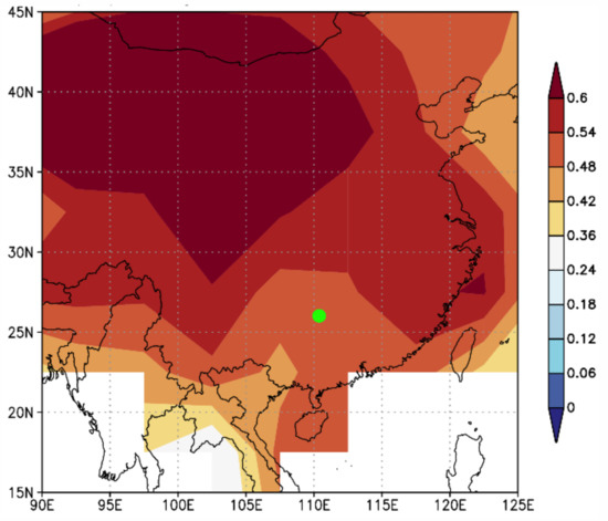 Spatial correlations between the reconstructed pMar-pOct mean temperature and the NCDC gridded temperature during 1958–2016. The green dot denotes the MRS site in this study. Shading denotes the correlations that are statistically significant at the 0.10 level.