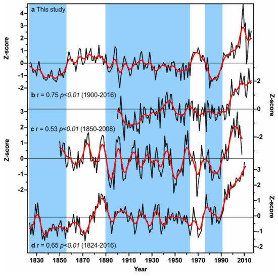 Multi-decadal variations were detected in the growing season temperature (pMar-pOct) reconstruction. Three major warm (1857–1890, 1964–1976, and 1992–2016) and cold (1824–1856, 1891–1963, and 1977–1991) periods were detected in the reconstruction period from 1824 to 2016. To further verify the reconstructed pMar-pOct mean temperature, three temperature series from nearby regions in central and south-central China were compared to our reconstruction (Figure 8), including the NCDC gridded GHCN v4.0.1 pMar-pOct temperature anomalies over the region of 20°–40° N and 100°–120° E over the period of 1900–2016 [50], the phenological and natural evidence based growing season temperature reconstruction during 1850–2008 in south-central China [62], and the tree-ring based February-May temperature reconstruction during 1824–2011 from the Shennongjia area in central China [63]. These three temperature records are significantly correlated with our reconstruction during their common periods (Figure 8). Many common variations can be found among these temperature records. For instance, the cold period in the 1970s–1980s was evident in all the temperature records. The major cold period in the 1890s–1950s was also found in all the four series, especially the extremely low temperatures in the 1890s, 1900s, and 1950s. The cold period in 1820s–1850s was also consistent with the tree-ring based February-May temperature reconstruction from central China [63]. Moreover, remarkable warming since the 1990s was observed in all the temperature series, suggesting that tree growth was effective at capturing the rapid warming signal in the area. As shown in Table 2, nine of the 10 warmest years in our reconstruction have occurred since 1999. However, there are some discrepancies among these temperature records, such as the warm periods in the 1860s and 1960s–1970s. These discrepancies may be related to the different reconstructed seasons and/or site-specific temperature anomalies at different locations. Regardless, the above comparison validates the general spatial representativeness of our growing season temperature reconstruction.
