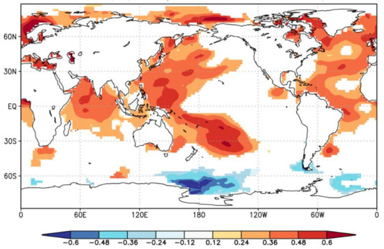 To explore the influences of global ocean SSTs on growing season temperature variations in the study area, spatial correlations were analyzed between the reconstructed pMar-pOct mean temperature and the global ERSST v5 SSTs during their common period of 1958–2016 (Figure 9). The reconstructed temperature is positively correlated with SSTs in the western Pacific Ocean, the northern Indian Ocean, and the northern and equatorial Atlantic Ocean. Hu et al. [64] indicated that warming in the tropical Indian Ocean Basin could trigger a low-level anomalous anticyclone circulation in the subtropical northwest Pacific, leading to above-normal surface air temperatures in south China. The reconstructed temperature is also significantly correlated with remote Atlantic Ocean SSTs, which may be explained by the ‘‘atmospheric bridge’’ that connects the large-scale atmospheric circulation anomalies in the Northern Hemisphere to the Atlantic Multidecadal Oscillation (AMO) [65]. Multi-decadal signal within a 30–60-year periodicity can be found in the TRW chronology during 1820s–2010s based on the result of wavelet power spectrum analysis (Figure 4), which is consistent with the periodicity of AMO [66,67]. Many studies have investigated the impacts of AMO on tree-ring based temperature variations in China and other regions around the world [68,69,70,71]. The warm/cold phases of the AMO could influence the positive/negative temperature anomalies over East Asia via strengthening/weakening the East Asian monsoon system [70]. Nonetheless, high resolution paleoclimate records are still scarce in the Pearl River basin. Future development of a large tree-ring network with long chronologies in the basin will help improve the understanding of regional temperature regimes and the AMO impacts in the basin.