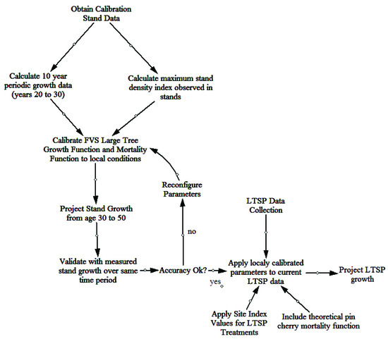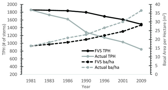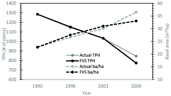 Model validation protocol generally follows the framework developed by the USFS FVS Steering Team [43]. Variables predicted by the base model (ba/ha, TPH, quadratic mean diameter) were first verified by comparing general stand dynamic patterns. Base model performance was analyzed using mean percent error (MPE), root mean squared error (RMSE), and graphical representations of basal area and trees per ha changes over time. Locally calibrated values for maximum SDI and large tree basal area growth were included in the model. The observed vs. predicted TPH and ba/ha values for each calibration stand were again analyzed using MPE, RMSE, and graphs. Once prediction error was reduced to less than 15% MPE for both TPH and ba/ha [44], the modified model parameters were applied to the LTSP plot data.