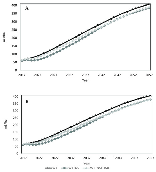 In the case of yellow-poplar, which is projected to be the dominant merchantable species in all treatment areas (Figure 5B), the increased volume associated with the WT plots was at least partly attributable to higher numbers of trees per ha in 2017 (21 years-old), and possibly a reflection of early treatment impacts (Table 4). However, considering that yellow-poplar is a shade-intolerant species [45], many of these smaller stems will die as the stand continues to grow over time, which might reduce the long-term impact of the high stem counts in the smallest diameter classes (Table 3). Additionally, there appears to be an ameliorative effect of adding lime to the acidification treatment for yellow-poplar given that the total volume for WT + NS and WT + NS + LIME treatments was similar, even though the number of stems on the liming treatment were much fewer. Despite these apparent effects, the difference between treatments is marked and suggests that the acidification treatment (WT + NS) still results in reduced growth rather than just a function of starting conditions.