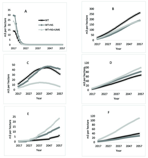 The total volume of sweet birch is projected to increase for all treatments until the trees are 40–50 (years 2037–2047) years old, after which mortality occurs in all treatments (Figure 5C). The WT + NS + LIME plots that started out with the lowest volume of sweet birch, also reached the point of maximum volume earliest. Between the years 2038 and 2057 in the projection, the volume of sweet birch on WT + NS + LIME plots declined from 15 m3/ha to 7 m3/ha. Both the WT and WT + NS plots reached their respective highest points of merchantable volume between the ages of 47 and 48, respectively. The WT plots reached a maximum predicted value of 44 m3/ha and the WT + NS plots culminated at 47 m3/ha. After this point, the mortality induced reduction in sweet birch volume on the WT plots was projected to decrease at a rate 2.5 times faster than the trees on the WT + NS plots.