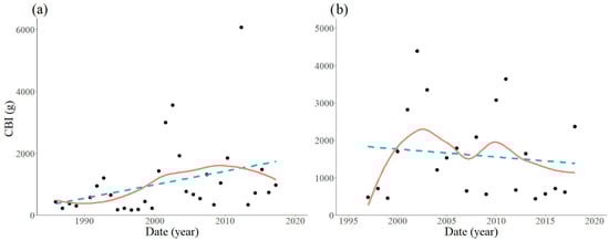Yearly values and long term trends of the estimated spring caterpillar mass at Kapuvár (a), and Várgesztes (b). (CBI, Caterpillar Biomass Index; blue dashed line, linear regression; red line, locally weighted regression with α = 0.8).