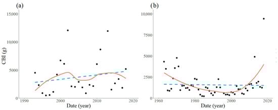 Yearly values and long term trends of the estimated spring caterpillar mass at Bakonybél (a), and Felsőtárkány (b). (CBI, Caterpillar Biomass Index; blue dashed line, linear regression; red line, locally weighted regression with α = 0.8).