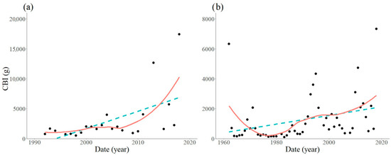 Yearly values and long term trends of the estimated spring caterpillar mass at Szalafő (a), and Sopron (b). (CBI, Caterpillar Biomass Index; blue dashed line, linear regression; red line, locally weighted regression with α = 0.8).