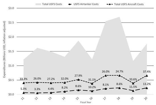 US Forest Service (USFS) wildfire suppression expenditures versus aviation costs by fiscal year (1 October through 30 September). Costs are fiscal year totals in 2020 US dollars, adjusted for inflation (CPI; https://www.bls.gov/regions/mid-atlantic/data/consumerpriceindexhistorical_us_table.htm (accessed on 28 July 2021)). USFS expenditures are from the National Interagency Fire Center (NIFC) published report [10]. Airtanker and all aircraft costs are obtained from USFS Aviation Business System (ABS) data and include all Agency costs, not limited to fire suppression. Non-fire costs average less than 5% of total aviation costs annually and are not omitted here due to data limitations and inconsistencies in ABS coding between analysis years.