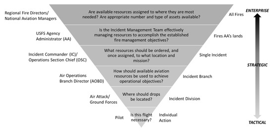 One unique challenge for aviation operations within this distributed control framework is that their physical location (e.g., airtanker base) is typically separated from the Incident Command Post where the rest of the IMT is located. Furthermore, some aircraft assignments are frequently short duration, which allow limited opportunity to interact with the assigned IMT. This environment creates a range of challenges in assuring that aviation operations align with the incident strategy. Figure 2 illustrates how different questions about aircraft are applicable at different management levels. Questions related to aircraft use begin with the pilot who asks: “Is this flight necessary?” With each progressive step up in supervision and oversight, the question of use broadens and shifts away from tactical toward strategic, then enterprise. Top-down information flow is critical to ensure that all decision makers are aware of the strategies that should be guiding their tactics. A single individual operating in isolation cannot truly answer whether a flight is necessary, but each has a key role in assuring safe and effective use of aviation resources.
