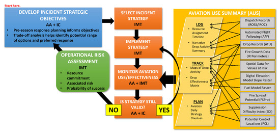 Flowchart depicting a risk-informed decision-making (RIDM) process that uses land management strategic objectives to inform a wildfire’s management strategy. The RIDM then monitors ongoing actions—in this example, aviation use and effectiveness—through development of the Aviation Use Summary (AUS). This information can help managers ensure the validity of a current strategy given changing conditions and fire growth, and an operational risk assessment informs development of alternative strategies. Examples of the AUS components included in this flowchart (e.g., Resource Assignment Timeline) are each presented later in this manuscript. AA—Agency Administrator; IMT—Incident Management Team; IC—Incident Commander; ROSS—Resource Ordering and Status System; IROC—Inter-agency Resource Ordering and Capability; ATU—Additional Telemetry Unit; IR—infrared; FSPro—Fire Spread Probability.