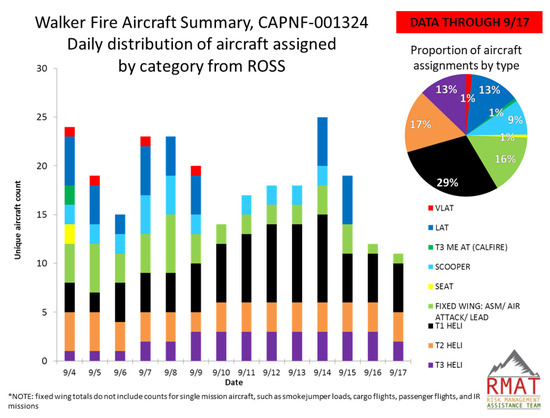 Resource Assignment Timeline from an Aviation Use Summary (AUS) for the Walker Fire from California in 2019. CAPNF—California Plumas National Forest; ROSS—Resource Ordering and Status System; VLAT—very large airtanker; LAT—large airtanker; T3 ME AT—type 3 multi-engine airtanker, CALFIRE—California Department of Forestry and Fire Protection; SEAT—single engine airtanker; ASM—aerial supervision module; LEAD—leadplane; T1 Heli—type 1 helicopter; T2 Heli—type 2 helicopter; T3 Heli—type 3 helicopter.