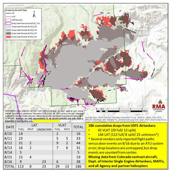 Example AUS drop overview map with narrative drop summary and supporting drop count table: Grizzly Creek Fire, Colorado, USA, 10–16 August 2020. LAT—large airtanker; VLAT—very large airtanker; USFS—United States Forest Service; MAFFS—Modular Airborne Firefighting System; Full—full load drop event; Split—split load drop event.