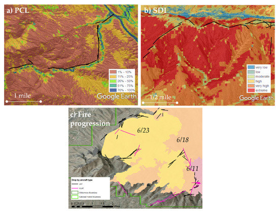 Mapping ATU airtanker drop records with (a) Potential Control Locations (PCL), (b) Suppression Difficulty Index (SDI), and (c) fire progression. LAT—large airtanker; VLAT—very large airtanker.