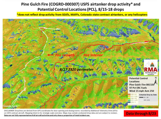 Nine days later, the Rocky Mountain Type 1 IMT ordered a second AUS to map extensive drop activity supporting a line building campaign along what the IC called the “Last Best Shot (Figure 8)”. Potential Control Location (PCL) data were used to help identify the landscape features with the highest likelihood of containment in an extremely challenging landscape with few potential holding features. This line represented the only retardant use during the IMT’s 19-day tenure on this incident. While this line was ultimately breached due to an unusual and isolated thunderstorm related wind event, the application of the AUS allowed for richer dialog around aviation strategies and for a defensible, documentable RIDM process [59].