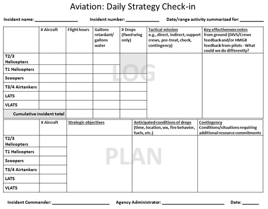 Expansion of the utilization of the AUS will require a shift in the temporal decision space so that the AUS is utilized more frequently as a forward-looking planning tool versus a backward-looking accountability tool. A structured decision-making process to facilitate and document a check-in and planning dialogue that utilizes key AUS data (ATU drop records and resource assignment summaries) can help ensure that ongoing use aligns with incident strategy and leader’s intent. Figure 9 depicts a prototype aviation check-in form. This prototype form is meant to coincide with the incident planning cycle, which may be daily or every few days, depending on the incident. It is designed with two key sections: log and plan. With automated ATU data widely available for all drop activities, incidents could readily use this information to facilitate informed discussions between the IC and Operations. The objective would be to discuss previous and ongoing actions, assess effectiveness, and use this information to formulate the plan. The IC then signs off on the plan which brings the scale of the decision in alignment with the authority of the decision maker. The AA(s) could also provide a review if they are particularly engaged or if there is an extensive air component for a specific fire. This could be especially valuable for fires burning across multiple land ownerships and jurisdictions and fires with multiple complex goals. This process does not usurp the ICS structure because it does not eliminate the tactical flexibility of operators. Conditions may change, and actions may well be warranted and executed that are outside of this plan. However, agreement about a general course of action and scale of aviation use given anticipated conditions and a well-defined incident strategy clearly brings feedback and learning into the decision-making process. It also introduces heightened accountability for making sure that tactical operators understand and are executing the strategy.