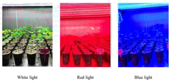 Red (R) and blue (B) monochromatic lights were set, and white light (W) was used as a control (Figure 1). A completely randomized trial was conducted with 36 seedlings in each treatment group. The light source was an LED lamp (provided by Xiamen Sannonghui Photoelectric Technology Limited, Xiamen, China). The wavelength of blue light was 460–465 nm, the wavelength of red light was 660–665 nm, and the light intensity was 250 μmol m−2 s−1. The light cycle of the artificial climate chamber was 16 h of light and 8 h of darkness, and the culture temperature was 25 °C. After 2 months of different monochromatic light treatments, representative individual plants were randomly selected, and each treatment had three biological replicates. Young leaves were picked and placed into an RNase-free cryopreservation tube. After 30 min of freezing in liquid nitrogen, the leaves were stored at −80 °C prior to sample sequencing.