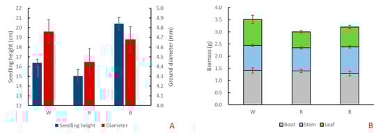 The growth changes of G. biloba under different monochromatic light. (A) Changes of seedling height and ground diameter of G. biloba seedlings under white (W), red (R), and blue (B) lights. (B) Biomass changes of roots, stems, and leaves of G. biloba seedlings.