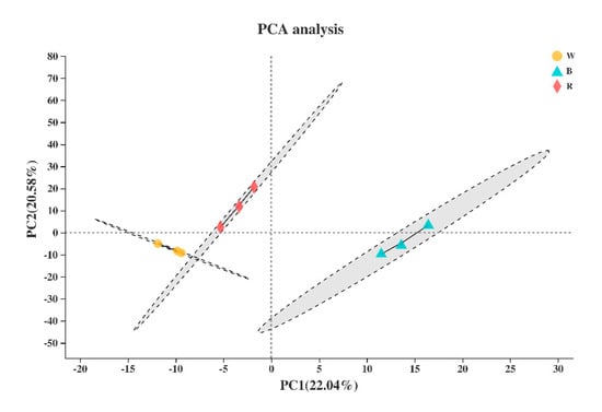 Principal component analysis (PCA) of the nine samples. W, B, and R represent white, blue, and red light, respectively.