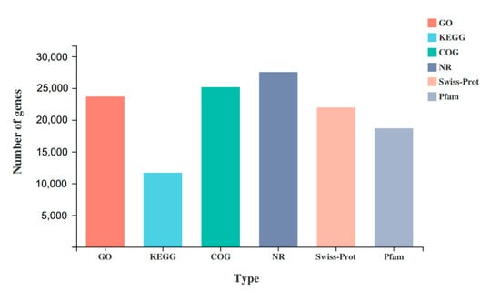 All unigenes were compared with the GO, KEGG, COG, NR, Swiss-Prot, and Pfam databases (Figure 4). A total of 31,695 unigenes were annotated, and 23,678 (74.71%), 11,673 (36.83%), 25,155 (79.37%), 27,544 (86.9%), 21,961 (69.29%), and 18,677 (58.93%) unigenes were annotated in the above databases, respectively.