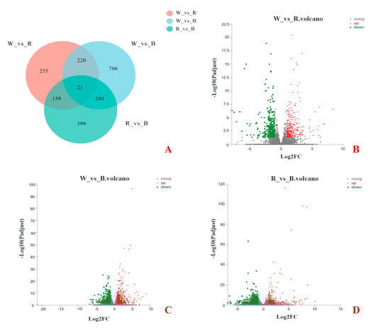 Differential gene expression among the three groups. (A) A Venn diagram describing overlaps among the DEGs in white (W), red (R), and blue (B) lights. (B) Volcano plot of DEGs between W and R lights. (C) Volcano plot of DEGs between W and B lights. (D) Volcano plot of DEGs between R and B lights.