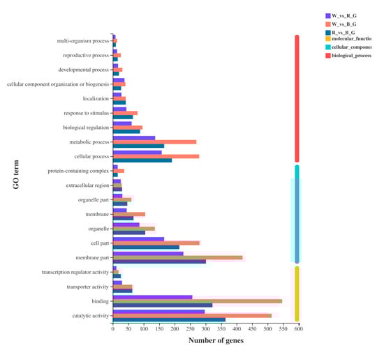 Based on the RPKM value, the differential expression of genes under different light treatments was analyzed. As shown in Figure 5A, 2040 DEGs identified from pairwise comparisons among the three groups of samples, and 21 genes were significantly different among the three groups. Among them, there were 655 DEGs between white light and red light, including 301 upregulated genes and 354 downregulated genes (Figure 5B), 1227 DEGs between white light and blue light, including 590 upregulated genes and 637 downregulated genes (Figure 5C), and 859 DEGs between red light and blue light, including 334 upregulated genes and 525 downregulated genes (Figure 5D).