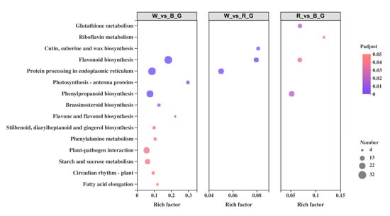 Among them, 12 metabolic pathways were significantly enriched between white light and blue light, including ‘flavonoid biosynthesis’, ‘protein processing in endoplasmic reticulum’, ‘photosynthesis-antenna proteins’, and ‘phenylpropanoid biosynthesis’. Three metabolic pathways were significantly enriched between white light and red light: ‘flavonoid biosynthesis’, ‘protein processing in endoplasmic reticulum’, and ‘cutin, suberine, and wax biosynthesis’. Four metabolic pathways were significantly enriched between red light and blue light: ‘glutathione metabolism’, ‘phenylpropanoid biosynthesis’, ‘flavonoid biosynthesis’, and ‘riboflavin metabolism’. The most abundant DEGs were in ‘flavonoid biosynthesis’ and ‘phenylpropanoid biosynthesis’, with 41 DEGs in each pathway, followed by ‘protein processing in endoplasmic reticulum’ and ‘plant-pathogen interaction’, with 33 and 31 DEGs, respectively. The deepest enrichment was ‘Photosynthesis-antenna proteins’, followed by ‘flavonoid biosynthesis’. It is worth noting that the pairwise comparison results all involved the process of ‘flavonoid biosynthesis’, in which 32 DEGs were enriched between white light and blue light, 14 DEGs were enriched between white light and red light, and 12 DEGs were enriched between red light and blue light.