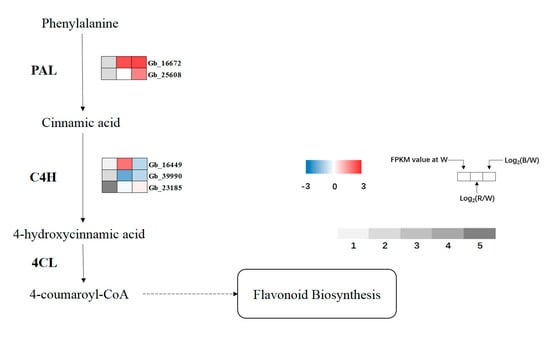 Three known key enzymes linked to secondary metabolism were selected to analyze the expression of related genes (Figure 8). Phenylalanine ammonia lyase (PAL), the first key enzyme and rate-limiting enzyme of phenylpropanoid biosynthesis, was upregulated under red and blue lights, and reached a significant level under blue light. In cinnamate-4-hydroxylase (C4H), the expression level of Gb_16449 increased under red light, which was significantly different from that under blue light. The expression of Gb_39990 in red light was significantly lower than that in white light. Compared with white light, the expression of Gb_23185 increased under red and blue lights, and reached a significant level under blue light. In contrast to the former two enzymes, there was no significant difference in 4-coumaroyl-CoA ligase (4CL) gene expression.