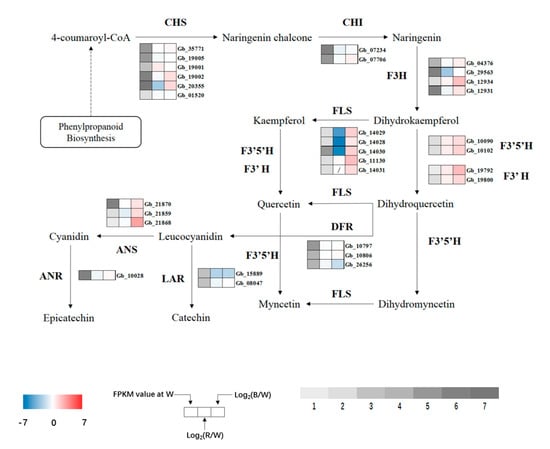 Flavonoids are important secondary metabolites in ginkgo leaves. They can deal with some abiotic stresses by activating antioxidant enzyme activity and scavenging free radicals [66]. The results of the present study show that flavonoid biosynthesis is the metabolic pathway with the highest concentration of DESs; 41 DEGs were enriched and 13 metabolic enzymes were involved.