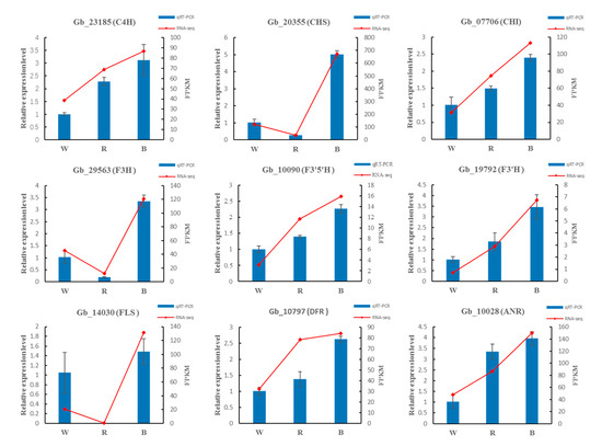 To verify the accuracy of RNA-Seq data, we randomly selected nine DEGs in the pathways of phenylpropanoid and flavonoid biosynthesis, using qRT-PCR. The qRT-PCR results showed that the expression trends of the nine enzyme genes under different monochromatic light were completely consistent with the trends of RNA-seq results (Figure 10).