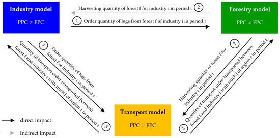 Calculation sequence considering planned procurement costs (PPC) and final procurement costs (FPC) of the industry, forestry, and transport model.