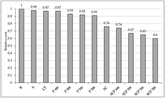 Benchmarking relative procurement costs of the base (B), satellite stockyard (S), coordinated transport (CT), payload (P 44/50/54/58 t), supply chain (SC), and supply chain payload (SCP 44/50/54/58 t) strategies.