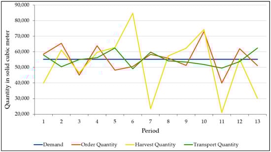 Looking at the material flow, industries are confronted with a consistent demand for wood products. The industry starts with the batch building leading to a coefficient of variation of the order quantity (COQ) of 16% for the industry. Afterward, forestry batches harvest operations even more resulting in a coefficient of variation of the harvest quantity (CHQ) of 37%. This increasing fluctuation along the supply chain is well known as the bullwhip effect as shown in Figure 3.