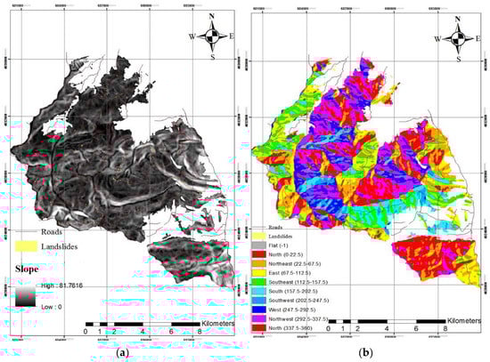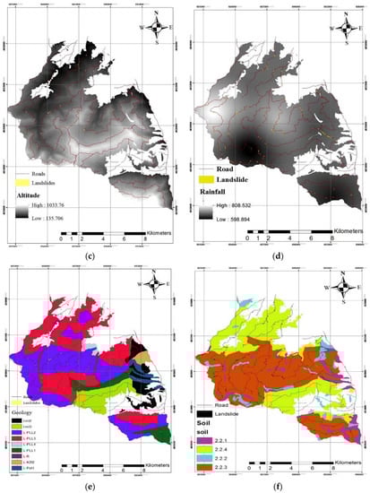 In LS mapping, it is expected that future landslides will happen under the same situations that caused prior landslides [53]. The diagnosis and mapping of an appropriate set of instability factors related to slope failures require former information about the original causes of landslides [55]. Selecting causal factors for application in the analysis can be carried out through a relatively flexible approach, and thus, the covariates selected in different studies vary within a broad range [56]. They ought to be chosen based on location, the scale of the area, the characteristics of the study area and the type of slip. In addition, the determination of landslide causal factors was associated with data availability [57].