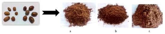 The roasting was performed at different time and temperature intervals to highlight the aroma and to obtain organoleptic characteristics as close as possible to those of cocoa powder. During the roasting process, the temperature in the room was 22–23 °C and the relative humidity was 40–42%. After grinding the roasted acorn kernels, three types of powders were obtained, heat treated differently. Figure 1a shows the powder obtained from heat-treated acorns at a temperature of 180 °C for 25 min, Figure 1b at 200 °C for 20 min and Figure 1c at 220 °C for 10 min, respectively.