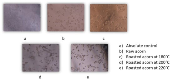 Following the results obtained, it is observed that the cell viability for the DLD-1 cancer line decreased considerably in the case of the aqueous extract obtained from the heat-treated acorn at 220 °C, registering a viability of 23.22% compared to the absolute control. According to Vinha et al., this is due to the fact that acorns have a high content of bioactive compounds that have many biological functions, such as antitumor, antiallergic, antithrombotic, anti-ischemic and anti-inflammatory activities [].