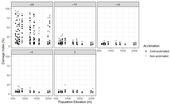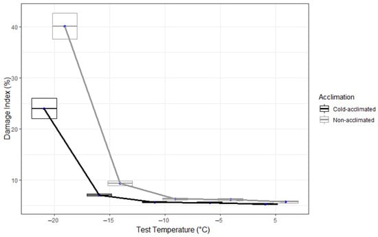 Interaction effects between test temperature (5, −5, −10, −15, and −20 °C) and acclimation treatment on the damage index (%) of samples averaged across koa population elevations (from 603 m to 2050 m). Each box represents the mean (±SE, standard error) damage index (%). Black dashes inside the boxes represent the means.