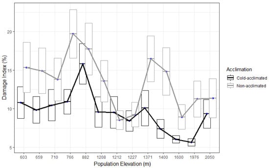 Interaction effects between the elevation (m) of koa populations and acclimation treatment on the damage index (%) of samples averaged across test temperatures (from 5 to −20 °C). Each box represents the mean (±SE, standard error) damage index (%). Black dashes inside the boxes represent the means.