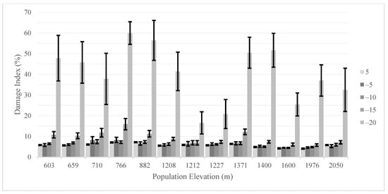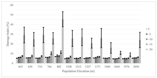 Mean (±SE, standard error) damage index (%) of frost damage for koa population from a range of elevations and test temperatures. Tissue samples were from cold-acclimated seedlings from 13 populations. Test temperatures consisted of a control at 5 °C, and four freezing temperatures: −5, −10, −15, and −20 °C.