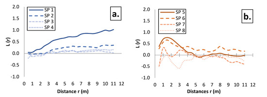 Ripley’s L(r) function of the spatial pattern of tree locations in the Serbian spruce (a) and Macedonian pine (b) forest communities. The values of the function higher than expected (positive values) show a tendency towards clumping, values lower than expected (negative values) show a tendency towards a regular distribution at the observed distance. For simplicity’s sake, lines that indicate a 99% confidence interval based on 199 Monte Carlo simulations of the null hypothesis of complete spatial randomness were not interpreted in this figure.
