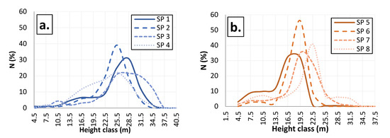 The distributions of trees by height classes in the sample plots in the investigated forest communities are graphically presented in Figure 3. Based on the testing of empirical height distributions (Mann–Whitney U test), a statistically significant difference (p < 0.05) was found between the distributions in the sample plots.