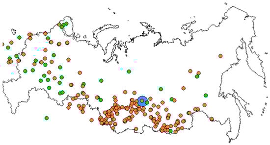 There are three databases of seed mass and environmental variables (geography, climate, soil) that were created for the bioclimatic modeling of P. sylvestris seed mass across the former Soviet Union. The first database included multi-year seed mass data collated by Cherepnin [3] from regularly collected and measured by many forestry units of the All-Union Forestry Agency. This study chose 166 signature sites with seed mass (mass of 1000 seeds) from [3] and assigned geographic coordinates (Figure 1) and multi-year means of climatic variables for each site from a close weather station within a 30 km radius on plains and calculated climate variables based on lapse rates in mountains. In Russian forestry practices, tree and shrub seed mass is measured based on the instructions of the State Standardization System (GOST in Russian, #13056.4-67). In particular, Scots pine seeds are harvested under the clearcutting of mature trees of 100–120 years old. All of the seeds are mixed, and two portions of 500 seeds are selected, weighted, averaged, and calculated for 1000 seed. This method is statistically significant and is used in various countries: all former Soviet Union countries, Eastern European countries, Turkey, Scandinavia, Mongolia, etc. [16,17,18].