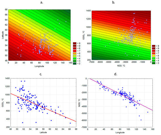 Figure 2. The dependence of Scots pine seed mass on latitude and longitude (a); GDD5 and NDD (b); the dependence of GDD5 on latitude (c); the dependence of NDD on longitude (d).