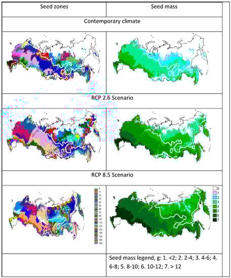 At present, the least productive seed zones with seed mass being less than 2 g and 2–4 g dominate the forest-tundra and northern taiga in cold climates. More productive seed zones with seed mass of 4–6 up to 6 g dominate the middle, southern, and subtaiga in moderately warm climates. In a warming climate under the RCP 2.6 scenario, more productive seed zones with a seed mass from 2–4 to 6–8 g would dominate the southern landscapes. The most productive seed zones, with seed mass 8–10 g, could be found in small areas of the temperate forest-steppe in East Europe. In the extremely warm climate under the RCP 8.5 scenario, seed zones with a seed mass 8–12 g were predicted to dominate larger temperate forest-steppe lands in Eastern Europe; however, the water availability would be a limiting factor at the southern border of the Scots pine range.