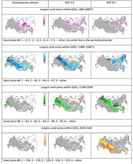The future location of climates inhabited by contemporary seed zones is expected to shift geographically. In cool summers (under GDD5 < 1080 °C) in forest-tundra, northern, and middle taiga, seed zones ## 2, 3, 4, and 7 with a prevailing seed mass of 2–4 g, were predicted in both the current and future climates. However, they would not be realized in the future because they were predicted to be in the permafrost zone (north of the permafrost border marked by the white line) where Scots pine cannot survive except for in warmer wide floodplains [32]. The warmer seed zones, ## 44, 45, 46, and 47, with a prevailing mass 4–6 g occurring in southern taiga, subtaiga, and forest-steppe (under GDD5 = 1080–1600 °C) would be realized in the current and the moderate RCP 2.6 climates, wherein the seed mass may reach 8 g. These seed zones were predicted to be south of the permafrost border. However, in the RCP 8.5 climate, these seed zones were predicted to cross the permafrost border so that they would not be suitable for the survival of Scots pines on cold soils with an ALD less than the 1.5 m (Figure 3). The warmer seed zones, ## 81, 82, 83, 84, and 87, would be realized in the southern taiga, subtaiga, and forest-steppe (under GDD5 = 1600–2000 °C) in the current and future climates, including the extreme RCP 8.5 climate scenario. The prevailing seed mass was predicted to be as high as 6–8 g under the moderate scenario RCP 2.6 and 8–12 g under the extreme scenario RCP 8.5. These seed zones were predicted south of the permafrost border where warm soils would be suitable for Scots pine. However, these predictions could only be realized under sufficient moisture conditions at the southern border of the Scots pine range. The warmest seed zones, ##118, 119, 120, 124, and 125, with a high seed mass of 10–12 g and higher would mostly be realized in the dry conditions of the forest-steppe (under GDD5 = 2000–2500 °C) in the extreme RCP 8.5 climate. Small coverage of the warmest seed zones, ##167, 173, 174, with a seed mass greater than 12 g were predicted in hot (under GDD5 > 2500 °C) and dry (AMI > 4.0) steppe habitats that could be suitable for Scots pine only in the permafrost zone, where the melting of the permafrost provides additional water.