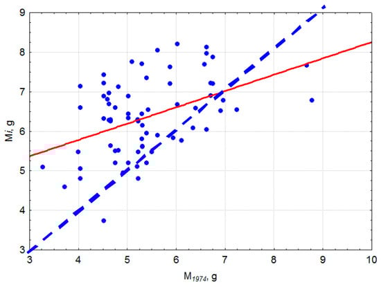 Figure 5. The relationship between provenance seed mass (Mi) for 1999–2003 and 2010 in the Boguchany common garden trial and provenance seed mass in 1974.