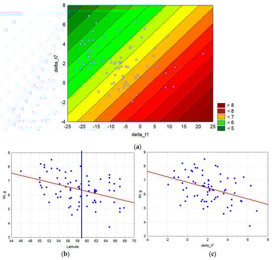 Seed mass at the test site was analyzed depending on a) the latitude of provenance (Figure 6a) and on b) the differences between the July temperature of the i-th year of seed measurements in the Boguchany test site and the multi-year mean (1960–1990) of provenance (Figure 6b) and on the c) differences between the January temperature of the i-th year of seed measurements in Boguchany and the multi-year mean (1960–1990) of provenance. The determination coefficients were weak (R2 = 0.14 and R2 = 0.21) for both the July and January temperature simple regressions; however, the multiple linear regression including both temperatures was good (R2 = 0.30, Equation (4), Figure 7).
