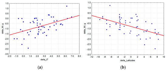 Figure 8. The dependence of the seed mass provenance differences and local seed mass (ΔMi) in measurement years 1999–2003 and 2010 in the Boguchany test site (the genetic component) on the July temperature difference in the measurement year at Boguchany and the multi-year mean of provenance (a) and the difference of Boguchany latitudes and provenance (b).